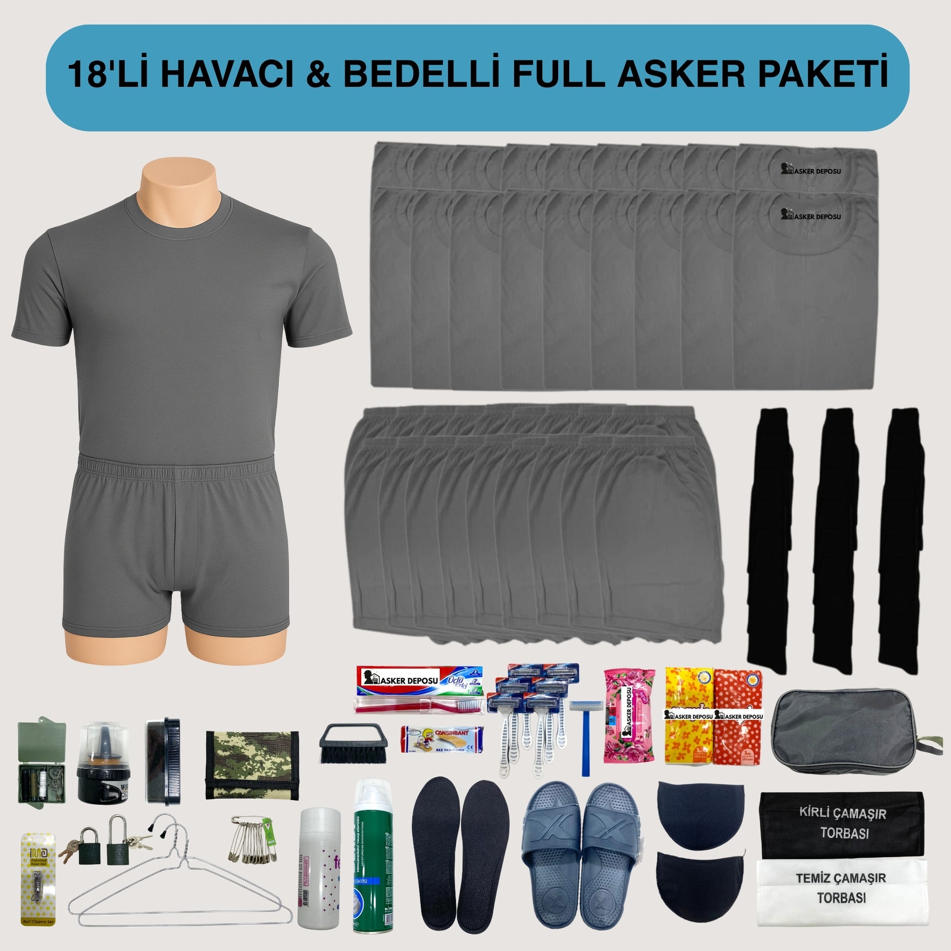 Asker Deposu güvencesiyle hazırlanan Asker Paketi ve Asker Full Paketi , temel iç giyimden kişisel bakıma, bot bakımından dolap düzenine kadar her detayı kapsayan eksiksiz bir teslim paketi sunar.Kendinize en uygun paketi seçip sipariş verebilirsiniz ürünlerimizin stok durumuna göre kişisel bakım ürünlerinde marka farkı değişkenlik gösterebilir.Ayrıca görsel ile ürünler arasında renk tonları olabilir.